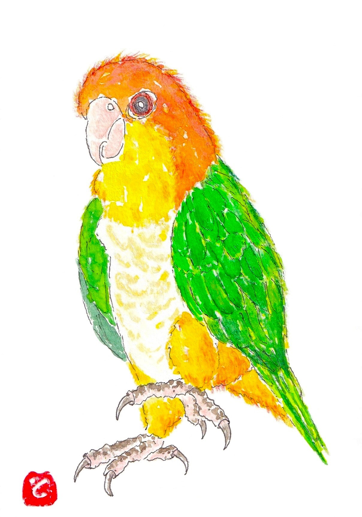 - 🐥シロハラインコ◎きれいな🐥インコさんに声をかけてみると…片脚をあげながら返事をしてくれました。まるで『はぁ~い!』と手をあげながら応えてくれているみたいでした😊 「きれいで かわいい🐥だなぁ~!」と絵を描いてみました😊