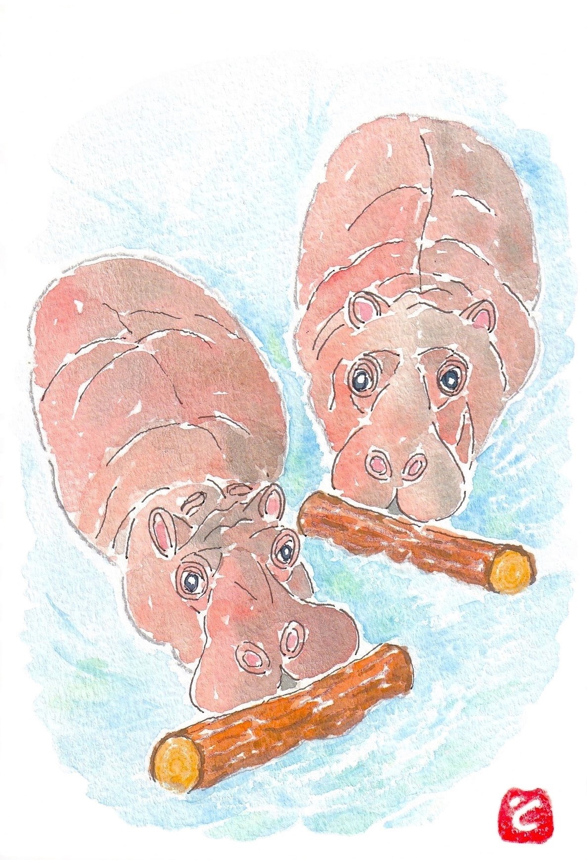 - なかよし🦛🦛カバ ◎熊本市動物園を訪れて、なかよしカバの❝🦛ソラ❞と❝🦛モモコ❞のところへ… 今回は、🦛🦛で丸太を押したり、回したりして仲良く遊んでいました。 なかよしの絵を描いてみました😊